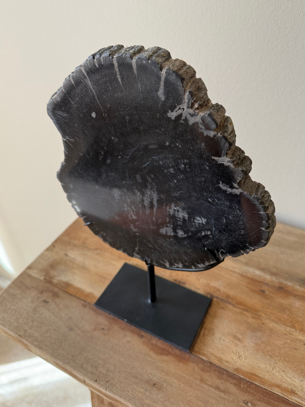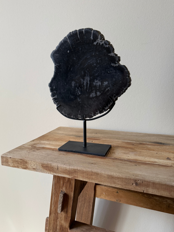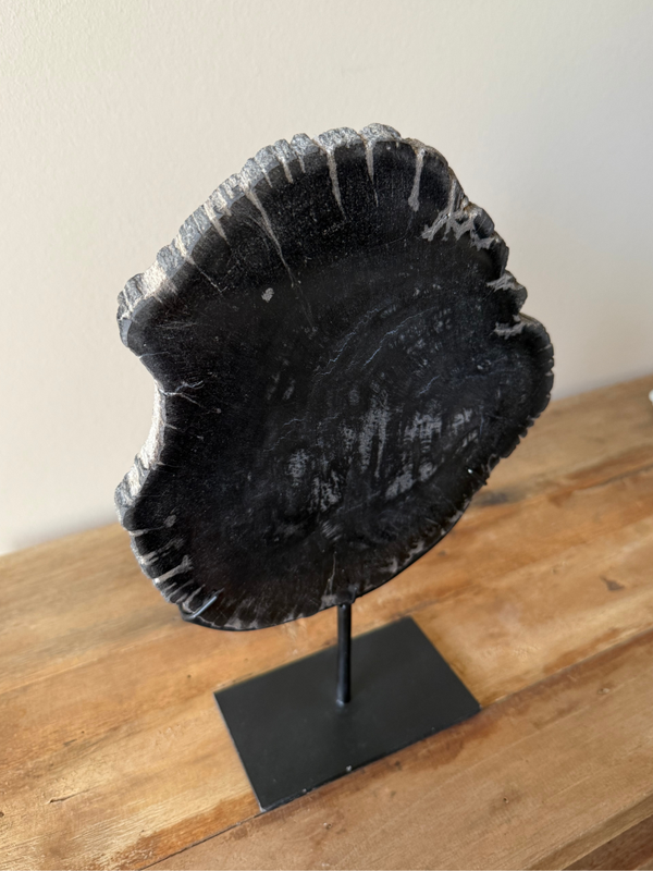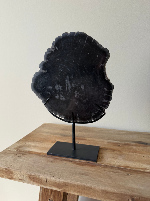 Breng een stukje geschiedenis en natuur in huis met onze prachtige versteend hout op metalen standaard.