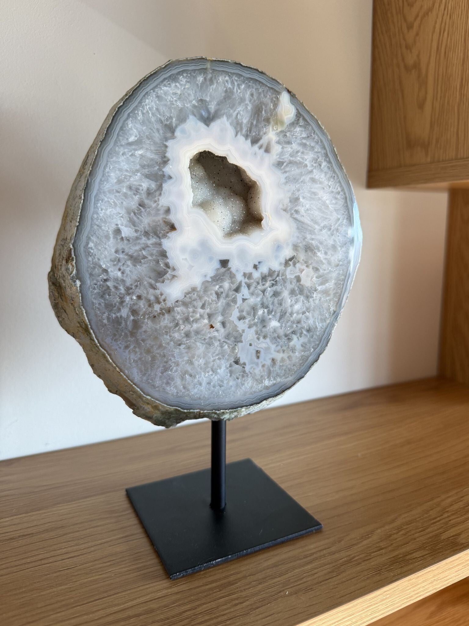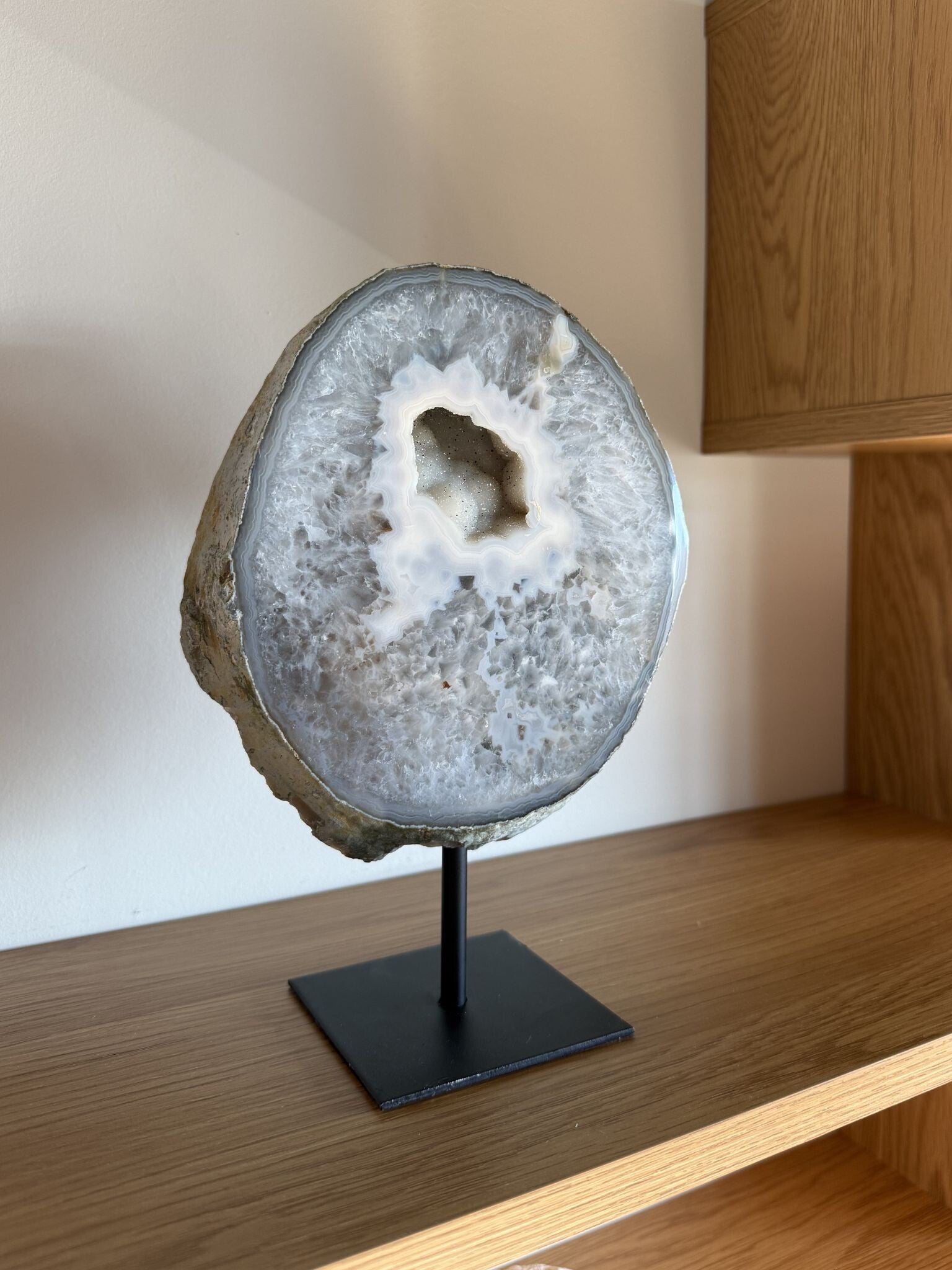 Ontdek de pracht van agaatgeodes op een metalen standaard, een perfecte combinatie van natuurlijke elegantie en moderne stijl.