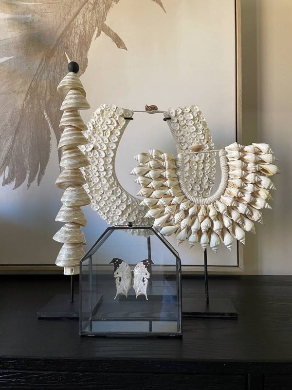 Creëer een sereen en elegant decor door de parelmoer schelpentoren te combineren met andere woonaccessoires, zoals versteend hout of onze vlinderkistjes. Deze toren staat prachtig alleen, maar komt ook tot zijn recht in een groep met andere decoratieve items voor een gelaagd, bohemian effect.
