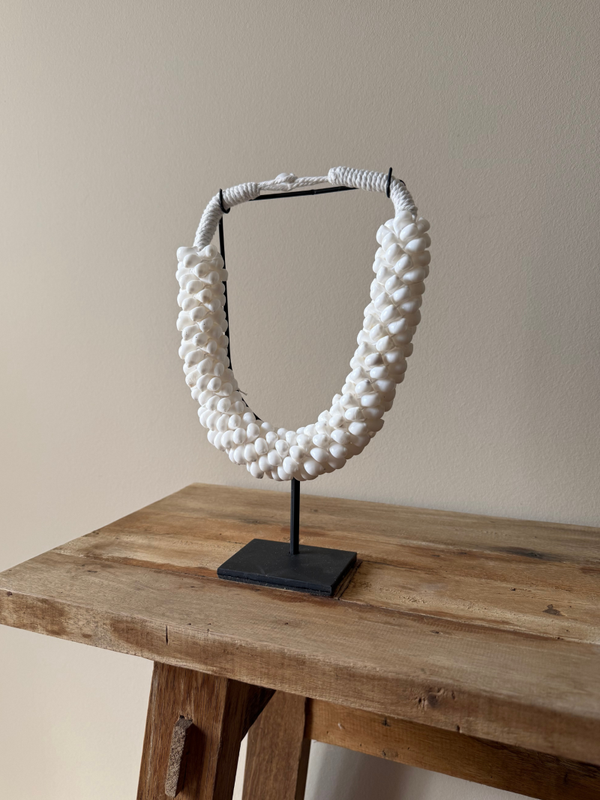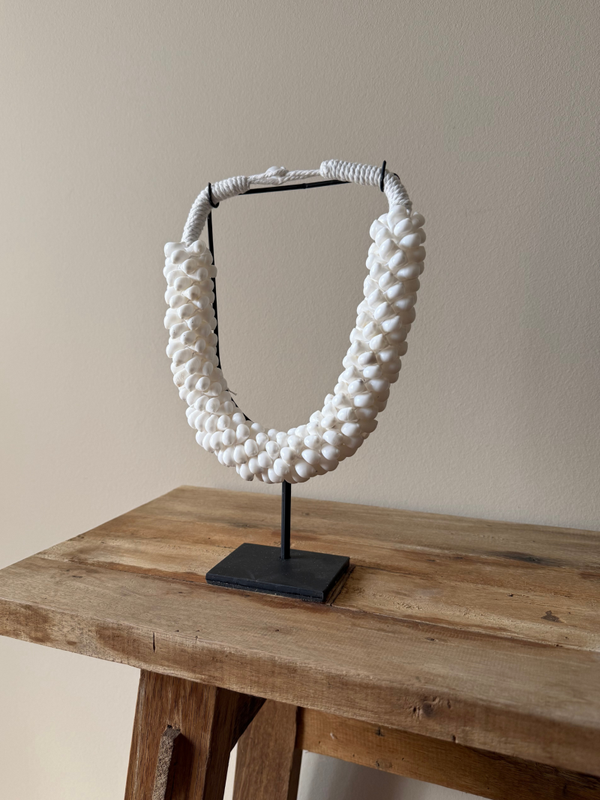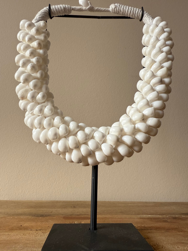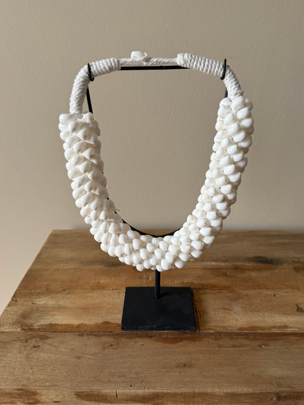 Laat jouw interieur spreken met de exotische en authentieke uitstraling van deze handgemaakte schelpenketting op standaard. Perfect voor liefhebbers van unieke, natuurlijke accessoires die een verhaal vertellen.