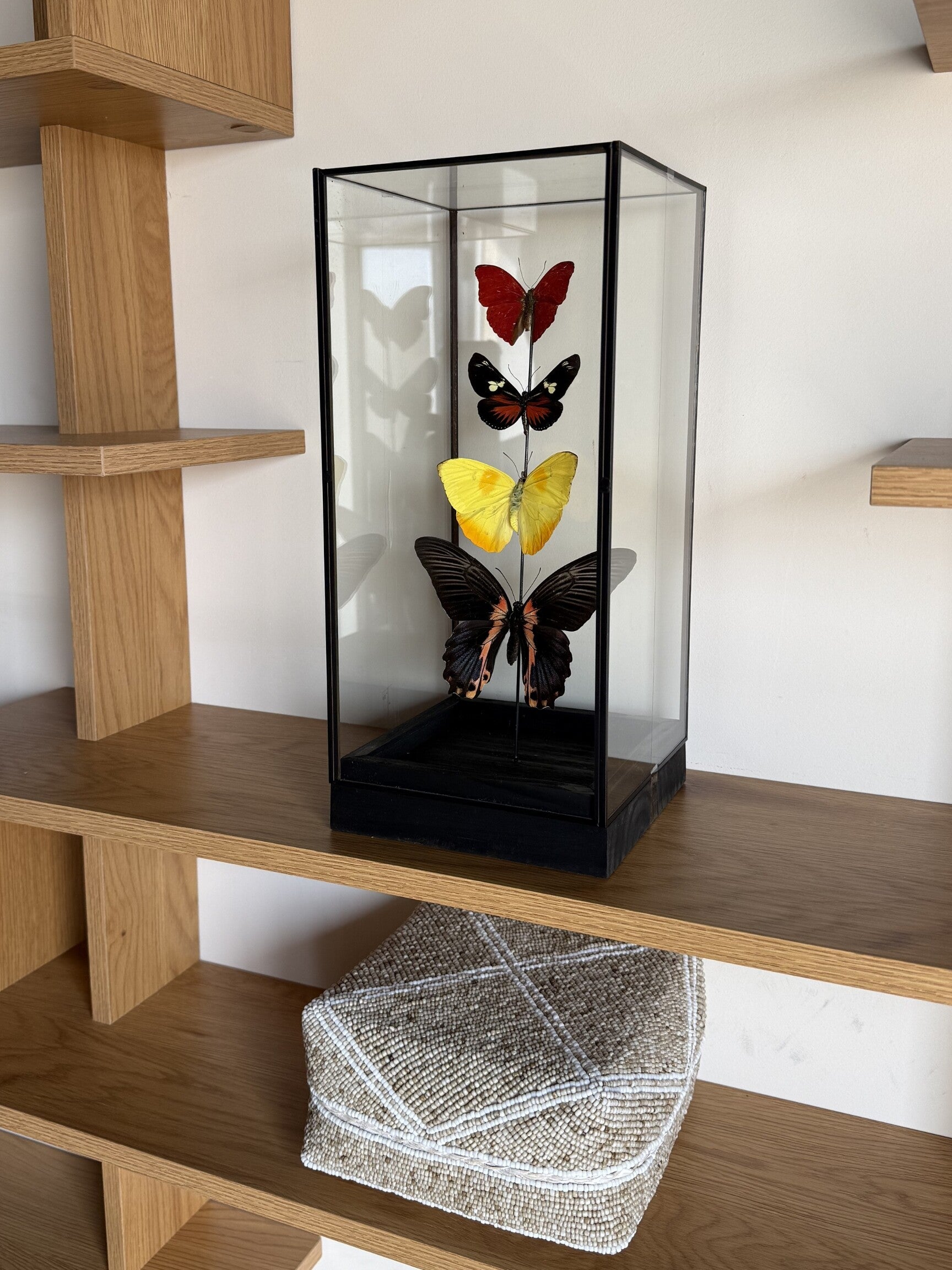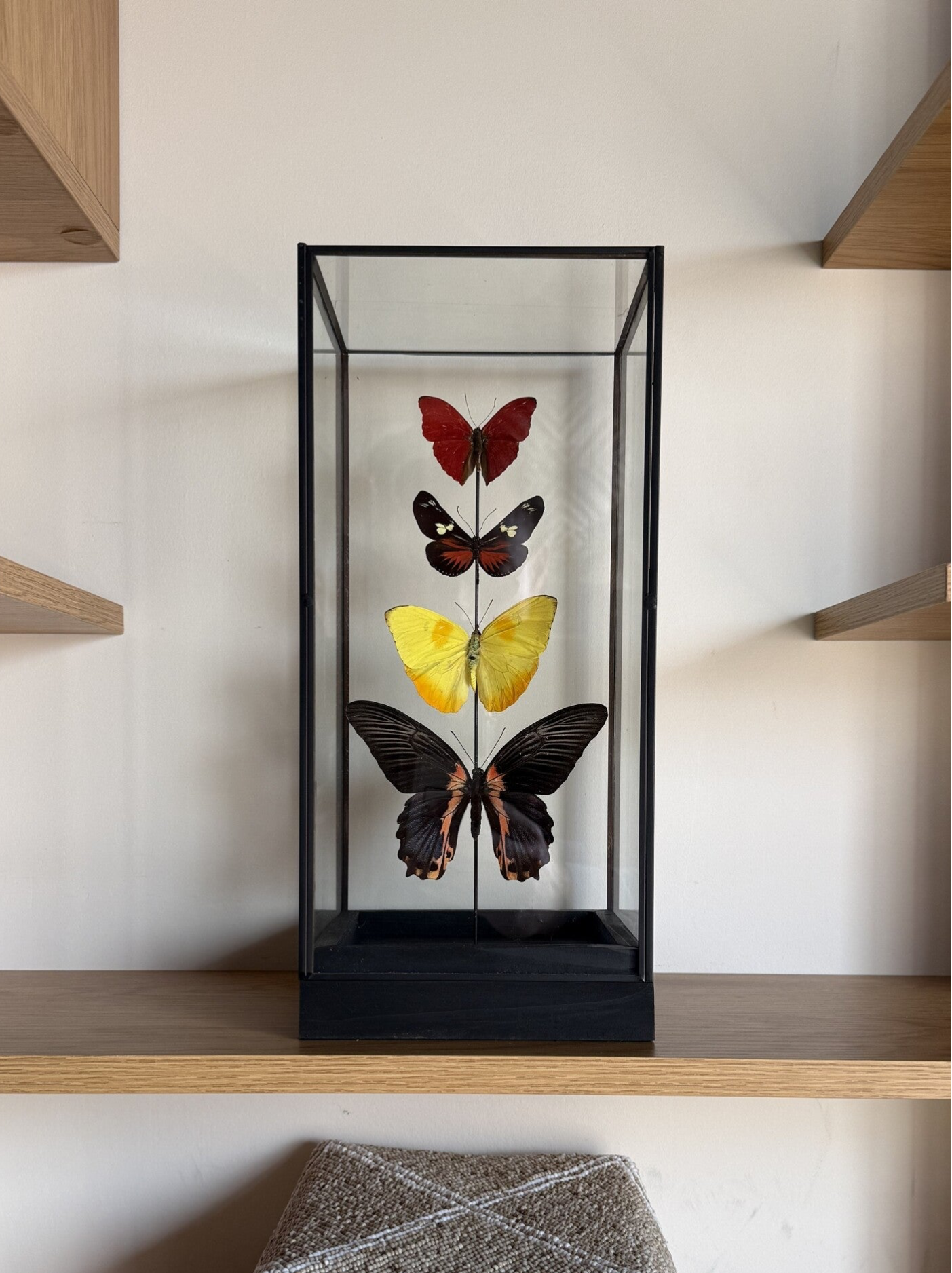 De vlinders zijn met zorg en vakmanschap opgezet en geplaatst in een stijlvolle glazen showcase met metalen stijlen en een zwart gelakte houten voet. De combinatie van glas, metaal en zwart hout geeft dit kunstwerk een moderne en luxe uitstraling.