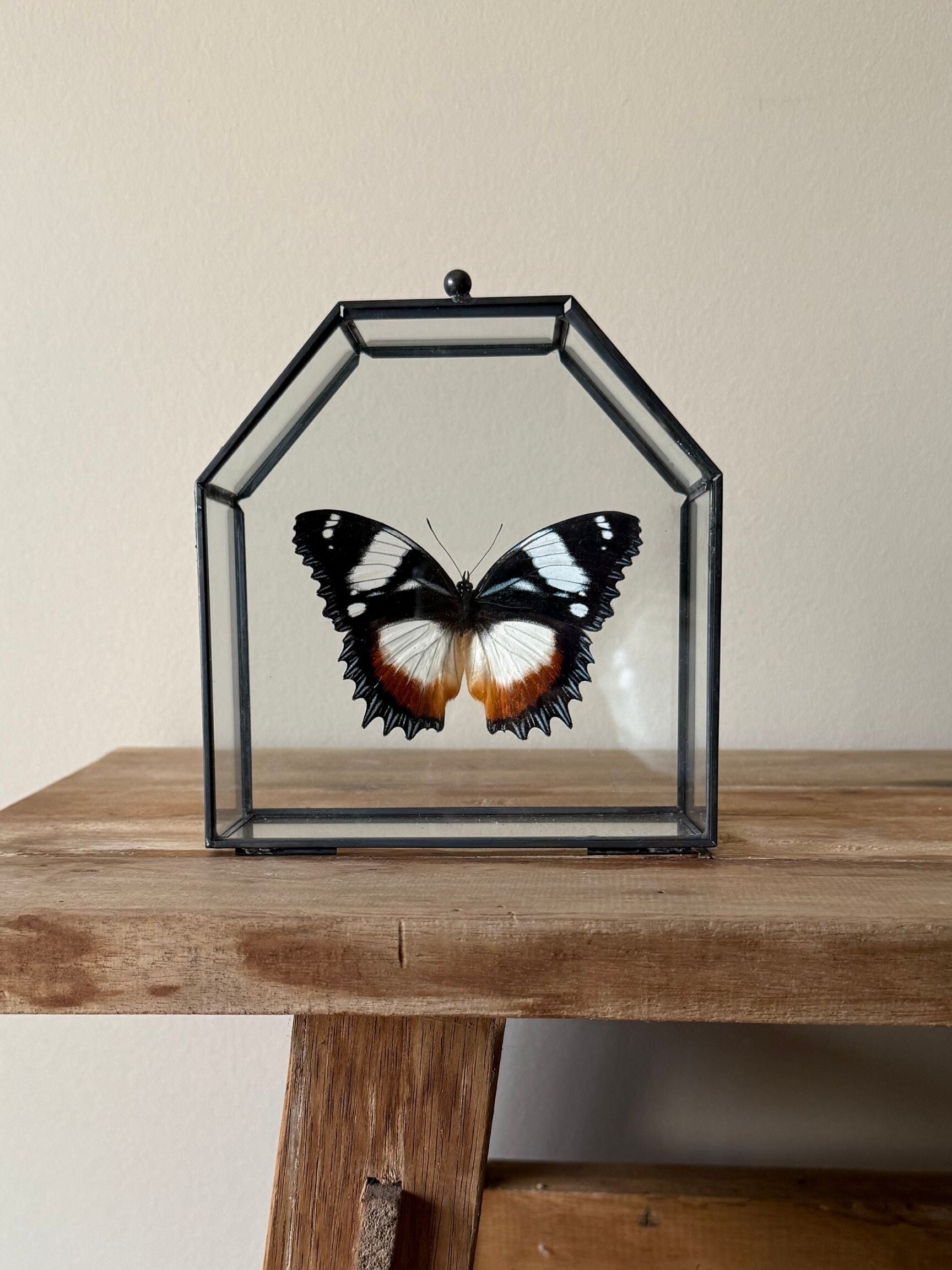 De vlinder wordt veilig beschermd door het glas, waardoor hij jarenlang in perfecte staat blijft.
