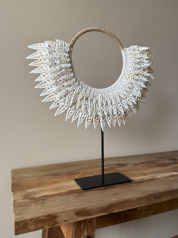 Laat jouw interieur spreken met de exotische en authentieke uitstraling van deze handgemaakte schelpenketting op standaard. Perfect voor liefhebbers van unieke, natuurlijke accessoires die een verhaal vertellen.
