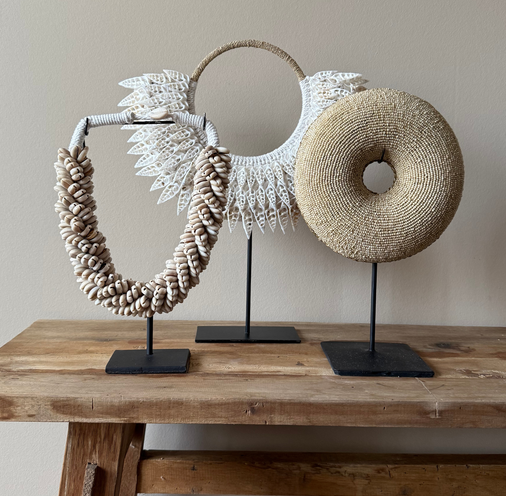 Laat jouw interieur spreken met de exotische en authentieke uitstraling van deze handgemaakte schelpenketting op standaard. Perfect voor liefhebbers van unieke, natuurlijke accessoires die een verhaal vertellen.