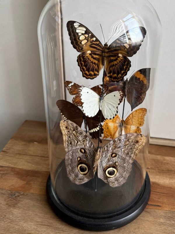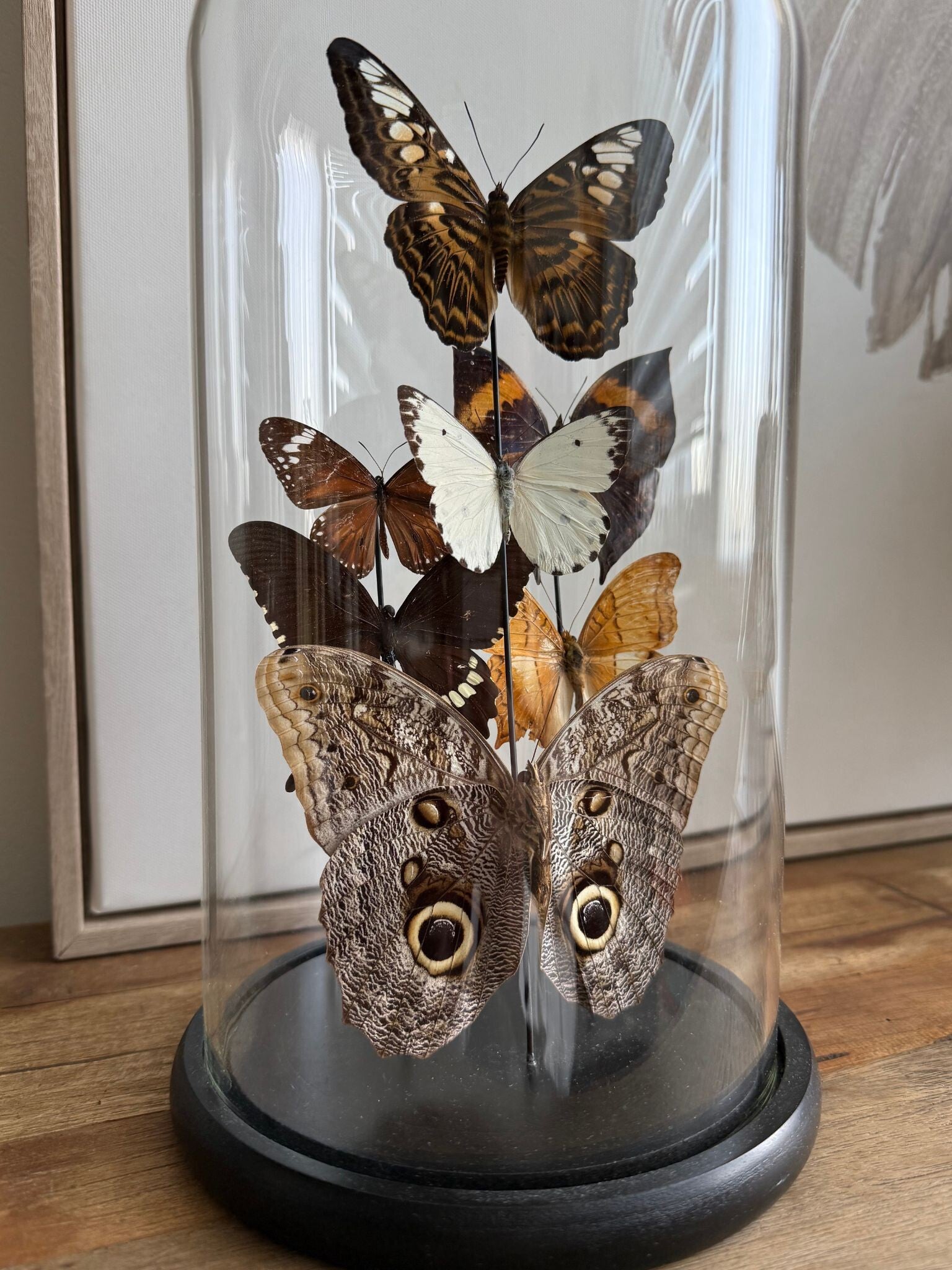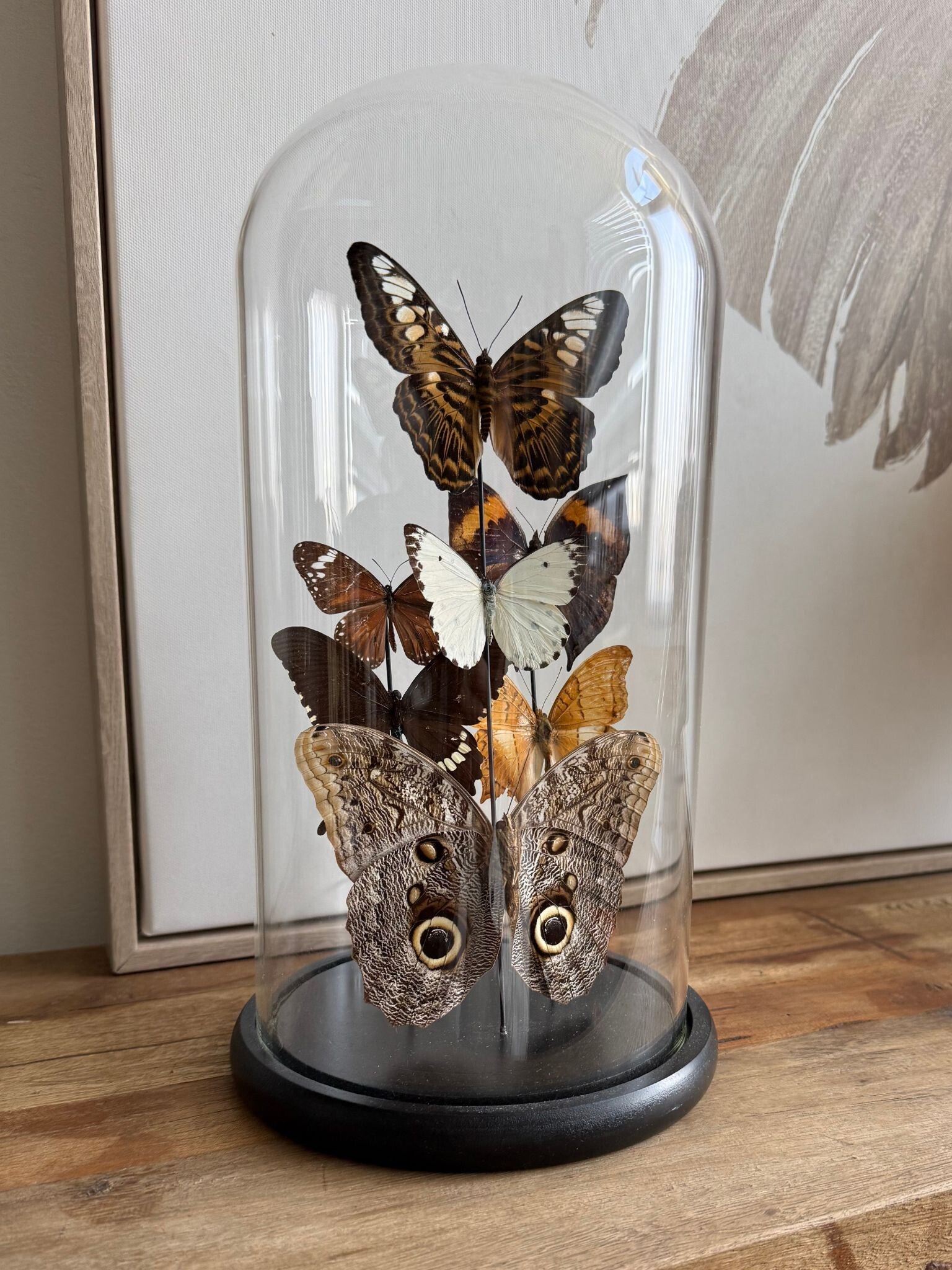 Voeg een vleugje natuur en kunst toe aan uw interieur met deze prachtige stolp. In deze stolp zijn 7 bijzondere vlinders zorgvuldig geplaatst, elk met hun eigen unieke kleuren en patronen. De glazen stolp en zwarte basis zorgen voor een stijlvolle presentatie die perfect past in elk interieur, van modern tot klassiek.
