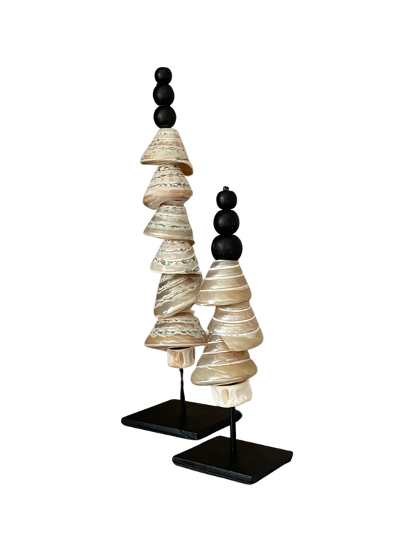 Voeg een stukje Indonesisch vakmanschap en de schoonheid van de natuur toe aan je interieur met deze unieke parelmoer schelpentoren op standaard. Een ideaal decoratiestuk voor liefhebbers van verfijnde, natuurlijke accessoires met een verhaal.