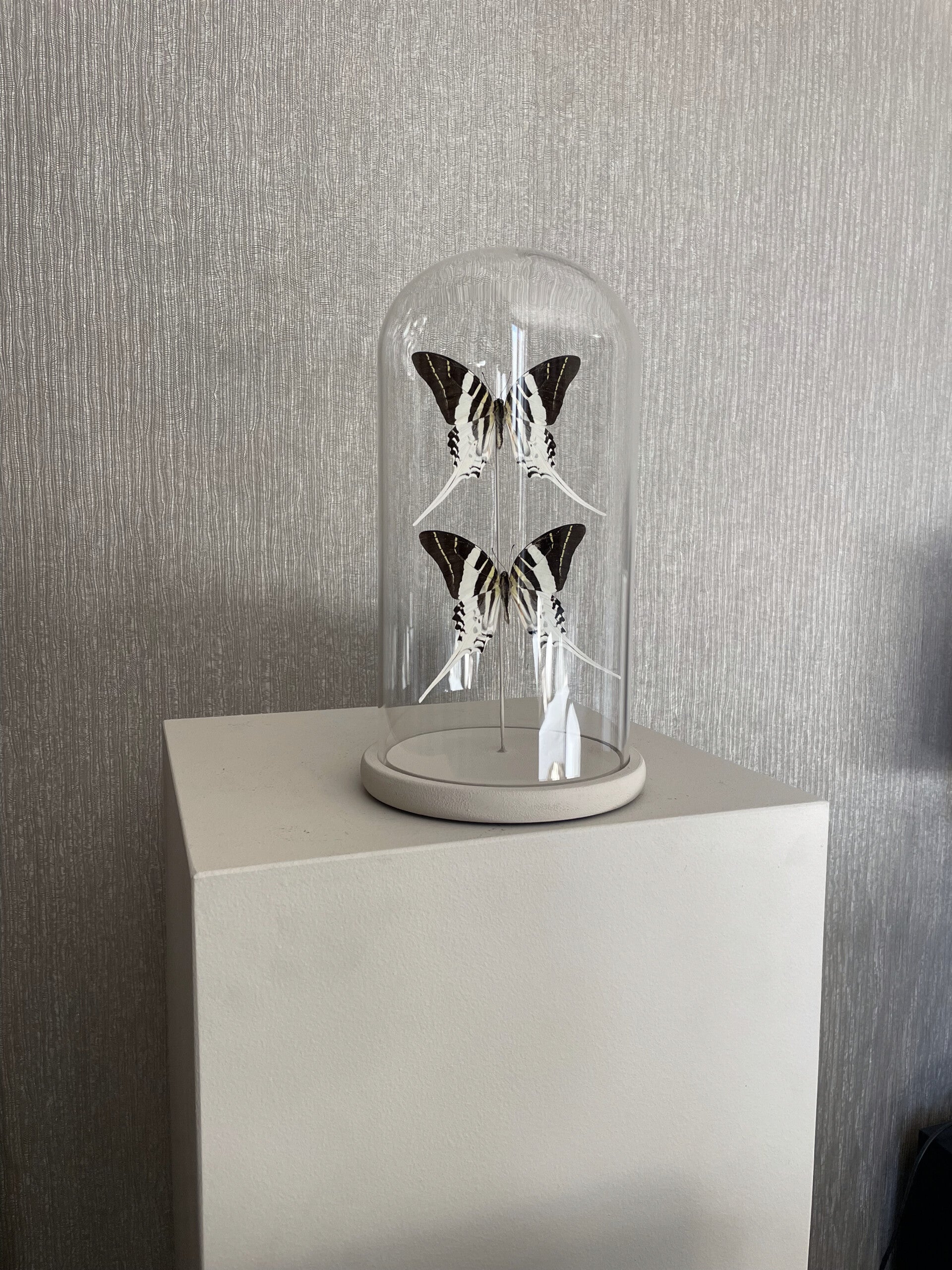 Een betoverend stukje natuur gevangen in een elegante stolp. Deze unieke vlinderstolp met beige houten voet bevat twee prachtig opgezette Graphium Androcles vlinders, bekend om hun sierlijke, langgerekte staarten en verfijnde zwart-witte vleugelpatroon.