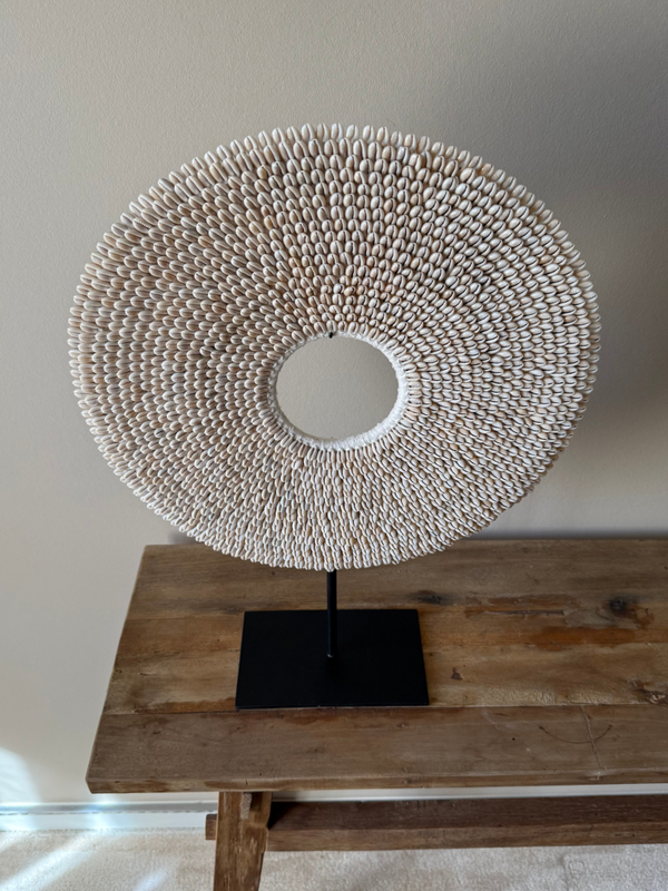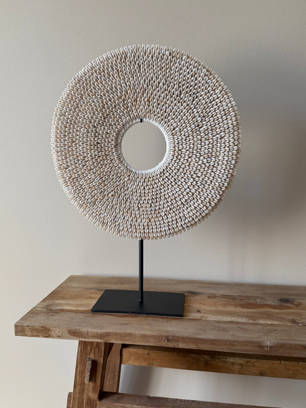 Deze luxe schelpen decoratie op standaard is een unieke eyecatcher voor elk interieur. De ronde schijf is met de hand gemaakt van honderden natuurlijke schelpen en staat op een elegante zwarte metalen voet. Perfect als boho woonaccessoire, voor een Japandi interieur, of als natuurlijke decoratie in een modern huis.