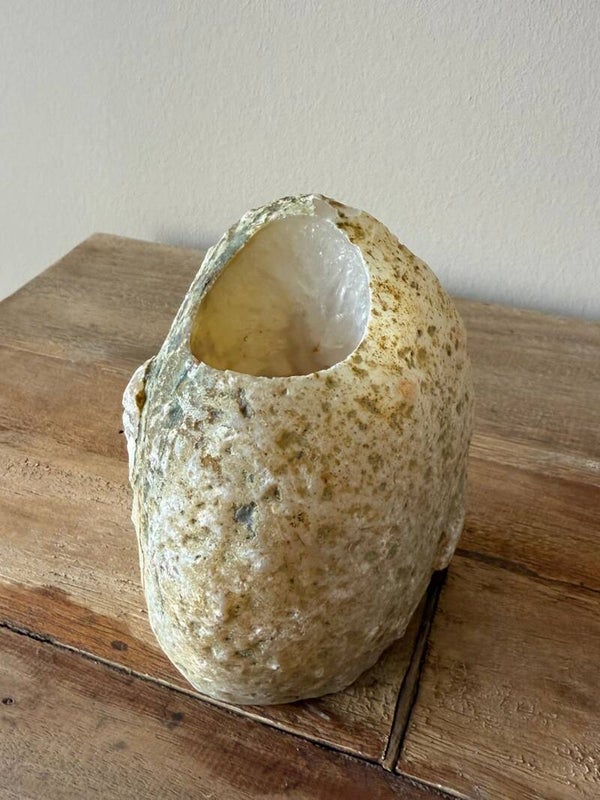 Breng een stukje pure natuur in huis met deze unieke agaat geode waxinelichthouder. Met zijn ruwe, aardse buitenkant en glanzend gepolijste binnenzijde is dit handgeslepen stuk niet alleen een sfeervolle kaarsenhouder, maar ook een waar kunstobject.