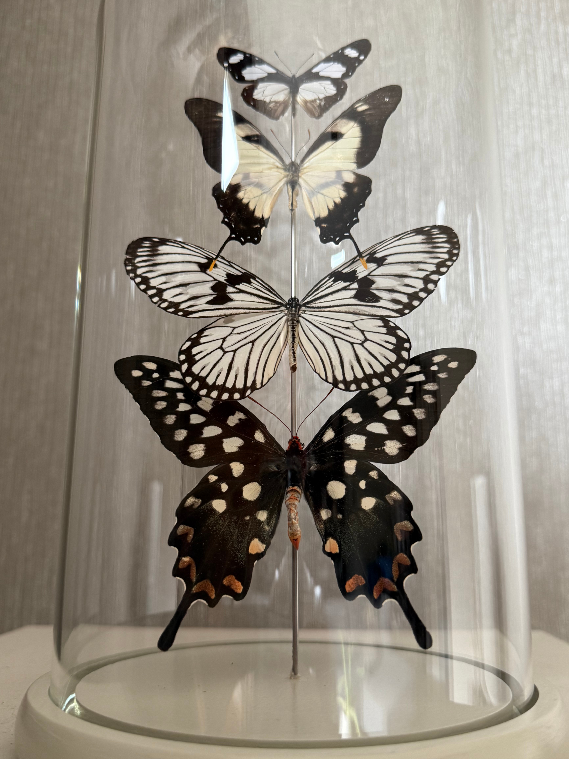 Breng de pracht van de natuur in huis met deze unieke, handgemaakte vlinderstolp. De Beige en wit-tonen creëren een levendig kleurenspel dat direct de aandacht trekt. Een bijzonder kunstobject dat een sfeervolle en elegante uitstraling geeft aan elk interieur.