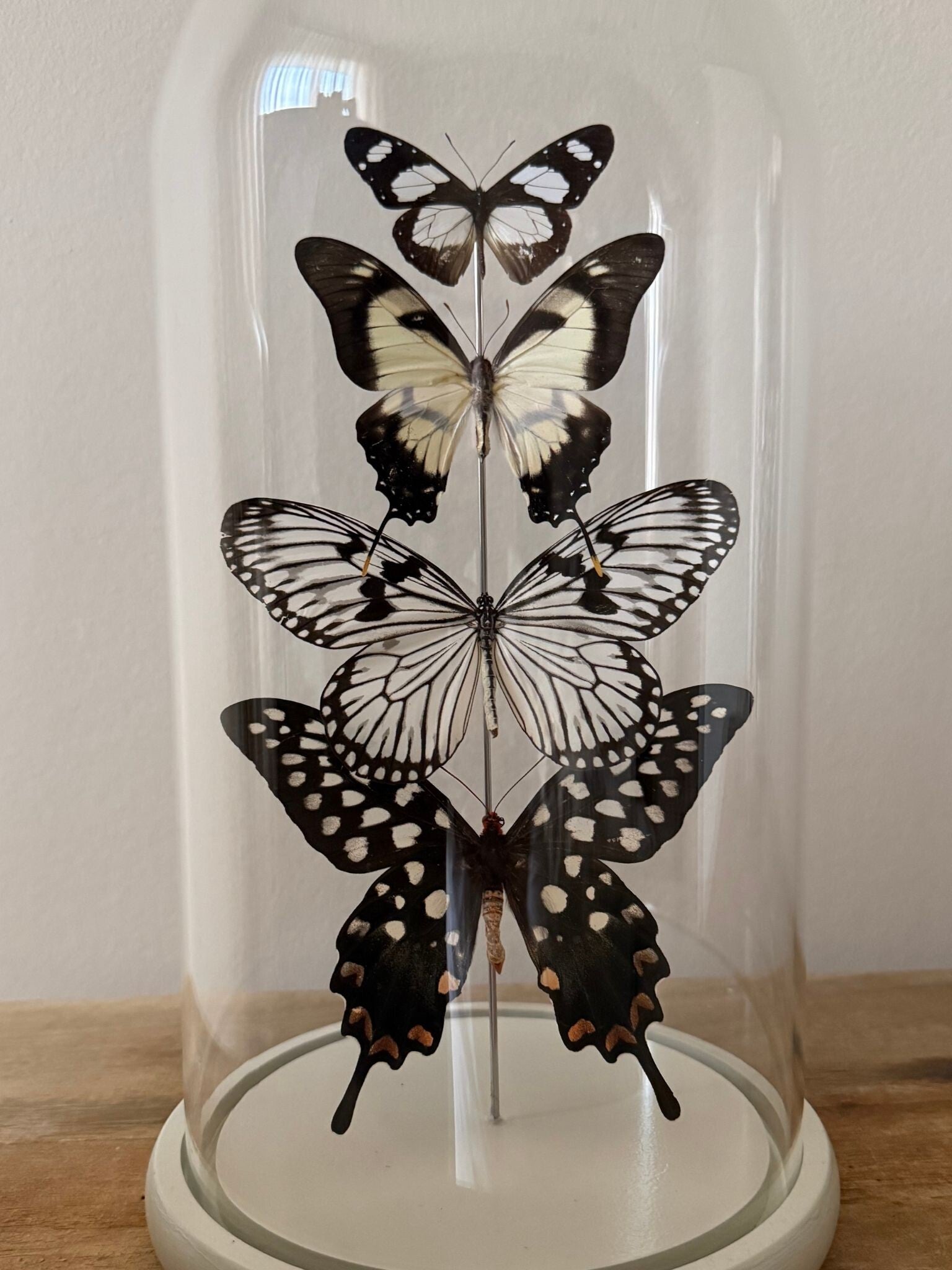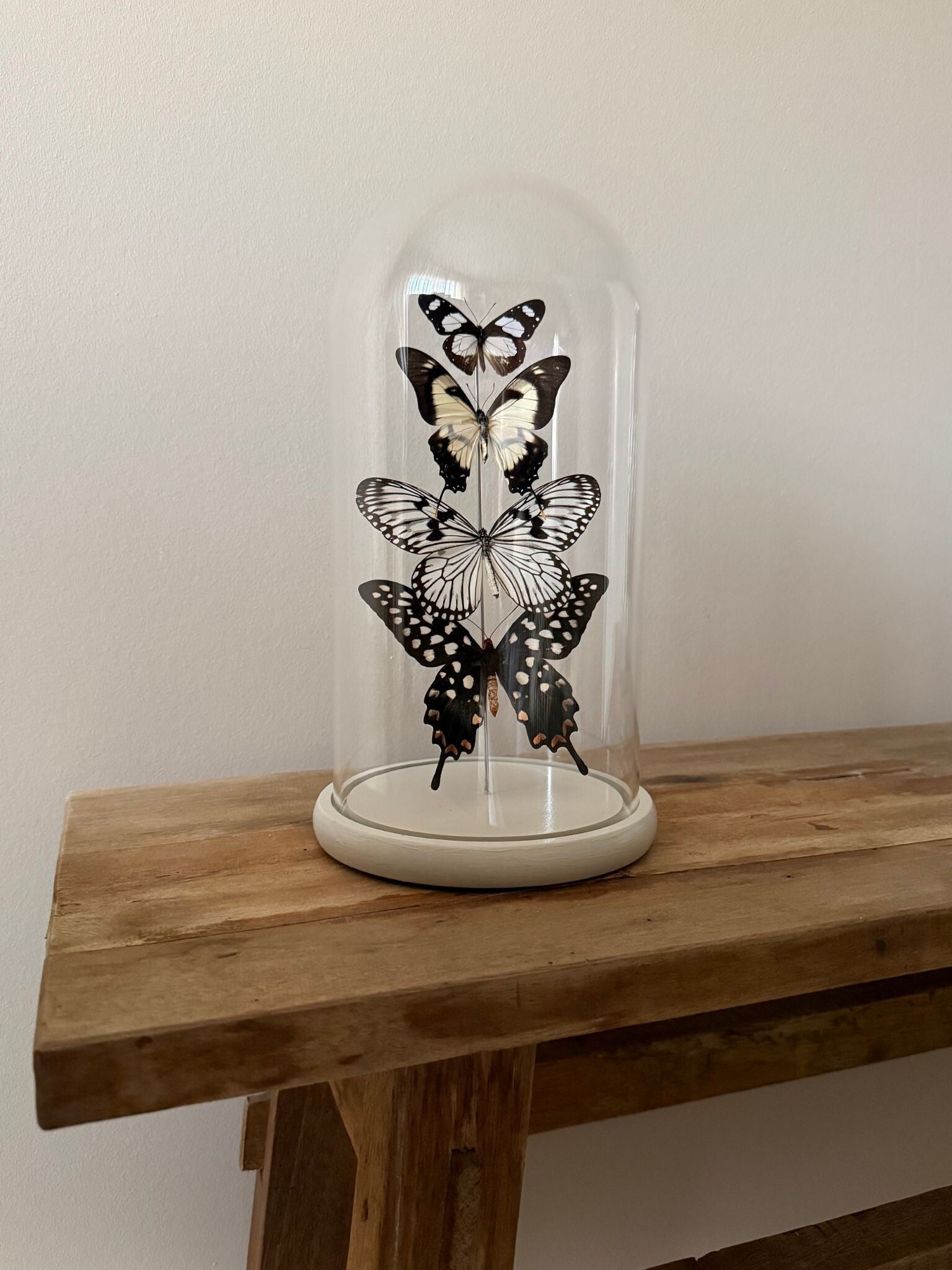 Elke vlinder is zorgvuldig met de hand geprepareerd en geplaatst, waardoor elke stolp een uniek stuk vakmanschap is. De glazen koepel rust op een beige houten voet en vormt samen een stijlvolle blikvanger – perfect voor op een dressoir, bijzettafel of in een vitrinekast.