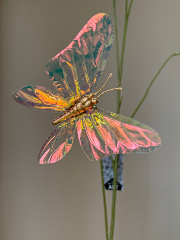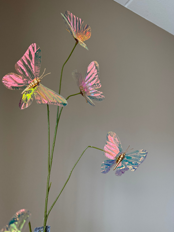 Deze decoratieve takken zijn veelzijdig inzetbaar: combineer ze in een zijdeboeket voor extra diepte en speelsheid, of plaats een enkele tak in een smalle tuitvaas als op zichzelf staand statement piece. Dankzij het holografische effect krijgen de vlinders een levendige, bijna iriserende uitstraling die elk interieur een exclusieve sfeer geeft.