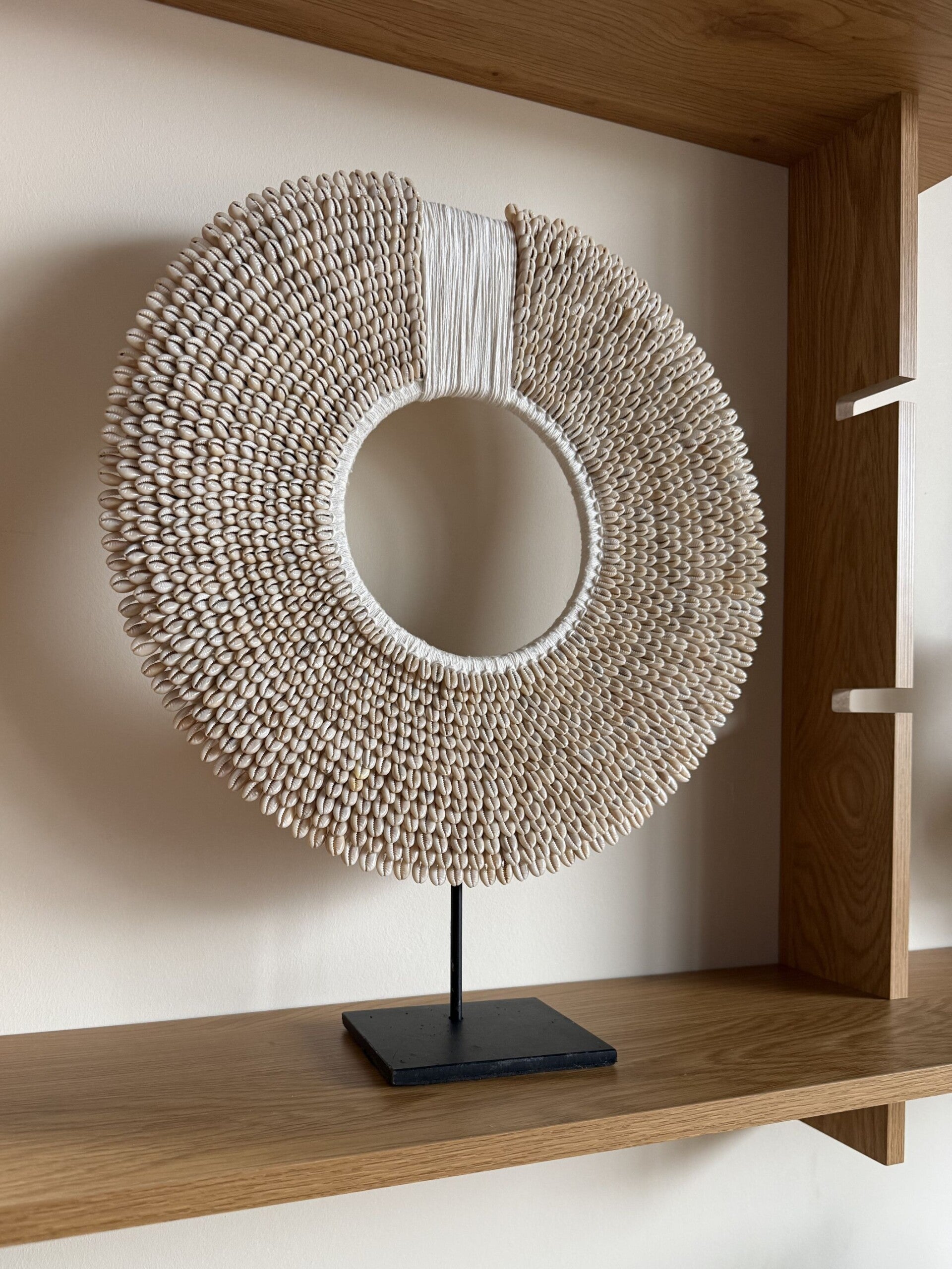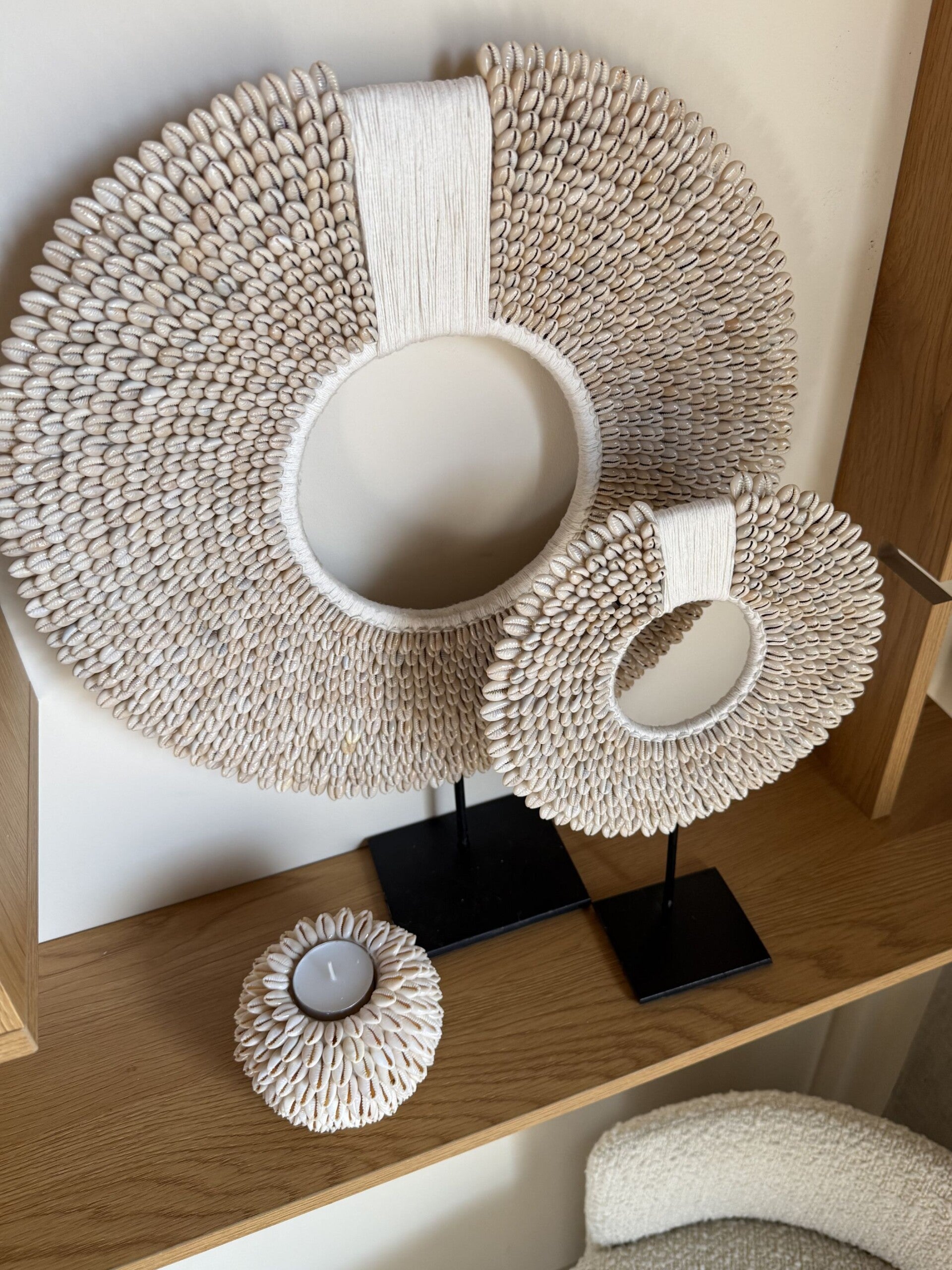 Handgemaakte Kauri Schelpencirkel op standaard Beige - 40cm doorsnee – Authentiek Indonesisch handwerk